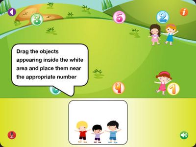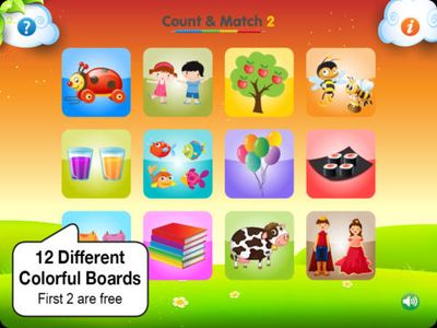 Deze app is het vervolg op Count & Match 1. Hierbij is het de bedoeling dat het cijfer wordt gematcht met het juiste aantal figuurtjes.